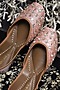 Featuring a pair of nude juttis in dupion silk base with mirror, zari, and zardosi hand embroidery. It has a genuine leather underlining and 2mm inch heel.