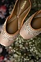 Featuring a pair of nude juttis in dupion silk base with mirror hand embroidery. It has a genuine leather underlining and 2mm inch heel.