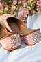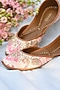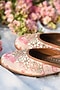 Featuring a pair of pink juttis in crepe base with gota patti hand embroidery and tie-dye. It has a genuine leather underlining and 2mm inch heel.