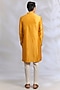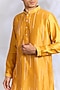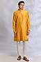 Featuring a mustard kurta in chanderi base. It is paired with pants. Style it with classic mojaris and a sleek watch for a refined look, perfect for wedding festivities, poojas or haldi ceremonies.