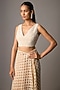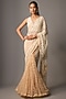 Featuring a beige lehenga saree in net base with hand and machine embroidery. It is paired with an embroidered blouse. Accentuate it with pearl or zircon jewellery, embellished heels and a potli bag for a traditional look, perfect wear for a wedding, engagement or sangeet ceremony.