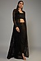 Featuring a black jacket in pure satin and net base with bugle beads embroidery. It is paired with a matching corset blouse and a draped skirt.