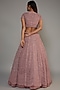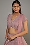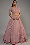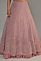 Featuring a blush pink lehenga in organza and soft net base with checks embroidery, including pearl and latkan detailing. It is paired with a matching blouse and a dupatta.