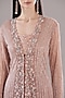 Featuring a dark peach long jacket in organza base with gold embroidery. It is paired with a matching blouse having floral details and a flared skirt.