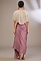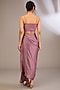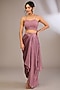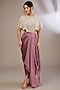 Featuring a dusty purple cape in pure satin and organza base with geometric pattern embroidery. It is paired with a bustier and a draped skirt. Accentuate it with statement earrings and heels for a cocktail or sangeet ceremony.