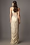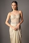 Featuring a gold draped gown in net and shimmer georgette base with hand embroidery. Accentuate it with statement earrings and sleek heels for a high-fashion edge, perfect for cocktail parties, receptions and glamorous evening events.