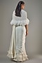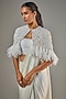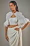 Featuring an ivory saree in satin georgette and viscose base. It is paired with a blouse and a jacket. Accentuate it with statement jewellery and heels for festive occasions or wedding ceremonies.
