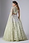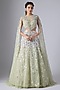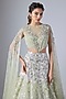 Featuring a mint green lehenga in net and organza base with hand and machine embroidery. It is paired with a blouse having jaal work and long veil sleeves. Accentuate it with polki jewellery, heels and an embellished clutch, perfect for weddings, engagement or sangeet ceremonies.