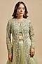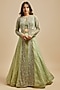 Featuring a mint green jacket in organza base with chitta work and embroidery. It is paired with a top and a lehenga. Accentuate it with statement earrings and heels for a mehendi or engagement ceremony.