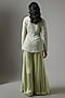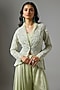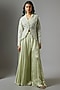 Featuring a mint green jacket in organza base with floral cutwork hand and machine embroidery. It is paired with flared pants. Accentuate it with statement crystal drop earrings and an embellished clutch to elevate the elegant silhouette, ideal for sangeets, mehendi functions or festive evening celebrations.