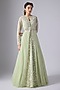 Featuring a mint green gathered kali jacket in taiwan net base with floral embroidery. It is paired with a bustier and a skirt. Accentuate it with pearl or diamond drop earrings, a sleek clutch and soft metallic heels for an elegant ensemble, ideal for sangeet, engagement ceremonies or reception celebrations.
