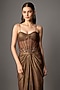 Featuring a mocha brown draped gown in net and shimmer georgette base with hand embroidery. Accentuate it with statement earrings and sleek heels for a high-fashion edge, perfect for cocktail parties, receptions and glamorous evening events.