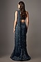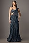 Featuring a navy blue saree in net and organza base with hand embroidery and feather palla detail. It is paired with a blouse. Accentuate it with statement earrings and heels for a sangeet, wedding or engagement ceremony.
