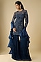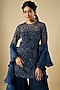 Featuring a navy Blue kurta in viscose georgette and net base with floral jaal work. It is paired with layered sharara pants and an organza ruffled dupatta. Accentuate it with statement earrings and heels for a festive occasion or sangeet ceremony.