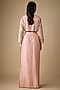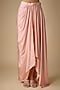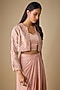 Featuring a peach draped skirt in satin base. It is paired with a bustier and an organza jacket having thread work and embellishment. Accentuate with diamond jewellery and heels for cocktail soirees.