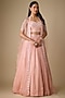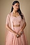 Featuring a peach lehenga in viscose and organza base with sequins embroidery. It is paired with an embroidered blouse and a jacket. Accentuate with polki jewellery and heels for sangeet, engagement ceremonies or weddings.