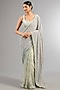 Featuring a powder blue saree in georgette base with an attached net skirt, ruched detailing, sequins and cutdana embellishment. It is paired with a blouse. Accentuate it with statement earrings and heels for festive occasions or wedding ceremony.
