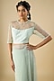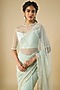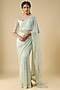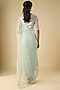 Featuring a powder blue saree in net base with jaal and cutdana embroidery. It is paired with a net and raw silk blouse. Accentuate it with statement jewellery and heels for a sangeet or engagement ceremony.