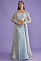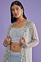 Featuring a powder blue jacket in organza base with hand embroidery. It is paired with a matching embroidered blouse and a flared skirt.