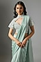 Featuring a powder ruffled saree in satin organza and satin georgette base. It is paired with an organza blouse having floral cutwork. Accentuate it with statement earrings, sleek metallic heels and a chic embellished clutch for a stylish ensemble, ideal for weddings, cocktail evenings or engagement celebrations.