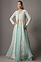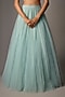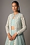 Featuring a powder blue gathered kalidar jacket in taiwan net base with floral embroidery. It is paired with a bustier and a skirt. Accentuate it with pearl or diamond drop earrings, a sleek clutch and soft metallic heels for an elegant ensemble, ideal for sangeet, engagement ceremonies or reception celebrations.
