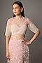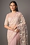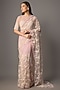 Featuring a powder pink saree in net base with 3D and aari embroidery. It is paired with a blouse. Accentuate it with statement earrings and heels for a festive occasion, wedding or engagement ceremony.