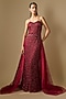 Featuring a red gown in net base with hand embroidery. It is paired with an inner and a trail. Accentuate it with dangler earrings, block heels, a clutch and soft curls, ideal for cocktail soirees.