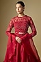 Featuring a red lehenga in net base. It is paired with a blouse and a dupatta. Accentuate it with zircon earrings, structured clutch and heels for a cocktail, sangeet or engagement party.