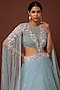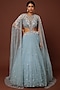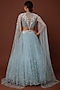Featuring a sky blue lehenga in net base with embroidery. It is paired with a blouse having attached long veil sleeves. Accentuate this designer set with statement jewellery and heels for a bridal look.