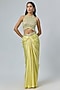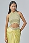 Featuring a yellow draped skirt in viscose and satin base with embellishment. It is paired with a halter neck bustier having drop pearls and tassel embroidery. Accentuate with diamond jewellery and heels for cocktail soirees.