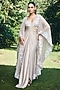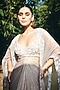 Featuring a blush peach cape in chiffon organza and foil satin base with embroidery and an attached blouse. It is paired with a draped skirt. Style this look with chandbali earrings, a chic potli, and mojaris for the perfect sangeet or a festive outfit.