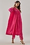 Featuring a pink kaftan in silk base with aari embroidery. It is paired with an inner and pants. Style this set with oxidized earrings and Kolhapuri sandals for a relaxed day out.