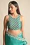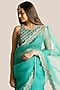 Featuring a teal saree in organza and silk base with hand embroidery. It is paired with a blouse. Style it with statement jewellery and heels for a wedding or festive occasion.