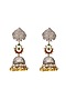 Featuring a pair of 22kt two tone plated jhumka earrings studded with red and green kundan polki including ghungroos, set in mixed metal.