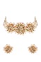 Featuring a gold finish handcrafted choker necklace studded with semi-precious stones and pearls, set in mixed metal. It is paired with a matching pair of earrings, a ring, and a bracelet.