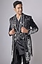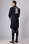 Featuring a black sherwani in silk satin base with sequins and thread embellishments. It is paired with a kurta and pants. Style it with a pair of loafers and a bracelet for engagement or sangeet ceremony.