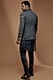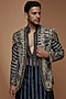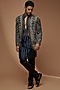 Featuring a grey open indo western jacket in south jute cotton blend base with swarovski, sequins, beads, and crystal embellishments. It is paired with a matching charcoal grey georgette sheer kurta and black turkish satin churidar pants.