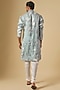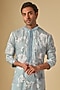 Featuring an ice blue kurta in organza base with floral print and embroidery. It is paired with ice grey satin churidar pants. Style it with loafers for a royal and refined look, perfect for a festive ready look.