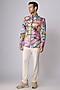 Featuring a multi-colored bomber jacket in japanese crepe base with hand painting, stone and sequins hand embroidery. Style it with a solid shirt, tailored trousers and sleek loafers to let the bold artwork stand out, creating a striking ensemble ideal for cocktail nights, upscale dinners, or contemporary festive events.