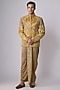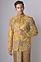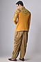 Featuring a yellow bandhgala in japanese crepe base with embellishments. It is paired with a lycra foil dhoti. Style it with a pair of mojaris and a mala for a wedding or haldi ceremony.