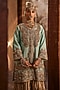 Featuring an azure blue jacket in wrinkled lame georgette base with zardosi, dabka and peacock motif embroidery. Style this designer jacket with sharara pants or a skirt, meenakari earrings and a potli bag, perfect for festive occasions, cocktail or sangeet nights.