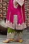 Featuring a pink kurta in silk base with kashmiri embroidery. It is paired with green silk salwar pants. Accentuate it with kundan polki jewellery, embellished heels and a potli bag for a wedding or sangeet ceremony.