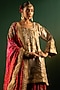 Featuring a gold kurta in lame brocade base with zardosi dabka and gota embroidery. It is paired with red upada silk sharara pants and a pink georgette bandhani dupatta. Accentuate it with kundan polki jewellery and heels for a wedding or sangeet ceremony.