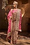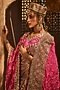 Featuring a slate grey crushed saree in cantaloupe base with resham, pearl, dabka and gota embroidery. It is paired with a neon pink blouse. Style this designer saree with meenakari earrings, kolhapuri block heels and a potli bag, perfect for a wedding, sangeet or engagement ceremony.