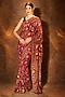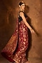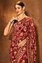 Featuring a wine saree in georgette base with resham and tilla embroidery, including an attached blouse. Accentuate it with zircon or swarovski jewellery, embellished heels and a clutch for a sangeet or cocktail ceremony.