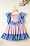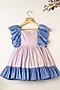 Featuring a purple and blue ruffled dress for girls in cotton base. Accessorize it with matching hair accessories and sandals for a stylish ensemble, ideal for any festive occasion or birthday party.