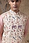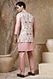 Featuring a beige nehru jacket in cotton silk and silk base with thread machine embroidery, floral and animal print. It is paired with a peach kurta and pants. Style the set with mojaris and a classic watch for sangeet ceremonies.