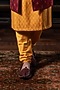 Featuring a honey yellow kurta in cotton silk base with thin pleats and scattered french knot embroidery. It is paired with matching churidar pants and a maroon hand-embroidered indo-western jacket.