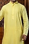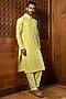 Featuring a yellow kurta in chanderi silk base with floral print. It is paired with white cotton satin pants. Perfect wear for a festive occasion or haldi ceremony, exuding traditional charm and elegance.