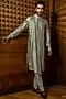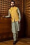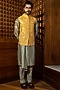 Featuring a mustard bundi jacket in pure silk base with paisley motifs. It is paired with a green pleated kurta and pants. Perfect wear for a wedding or haldi ceremony, exuding charm and elegance.